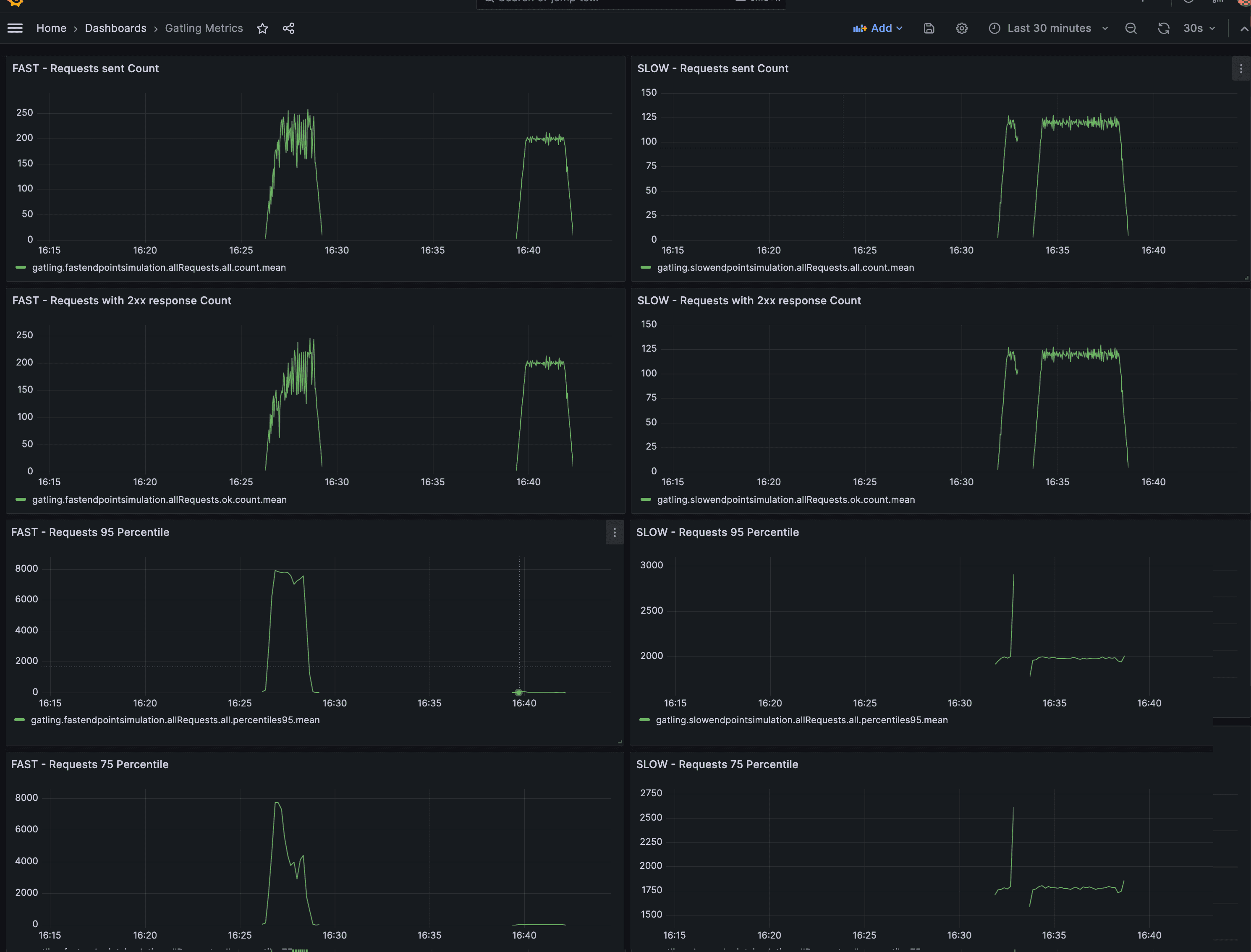 启动所有服务。服务就绪后,通过Maven执行Gatling模拟测试: