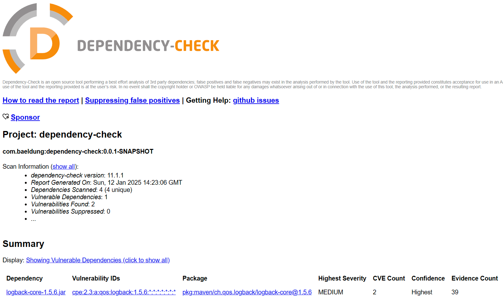 同时生成详细 HTML 报告(文件路径:target/dependency-check-report.html