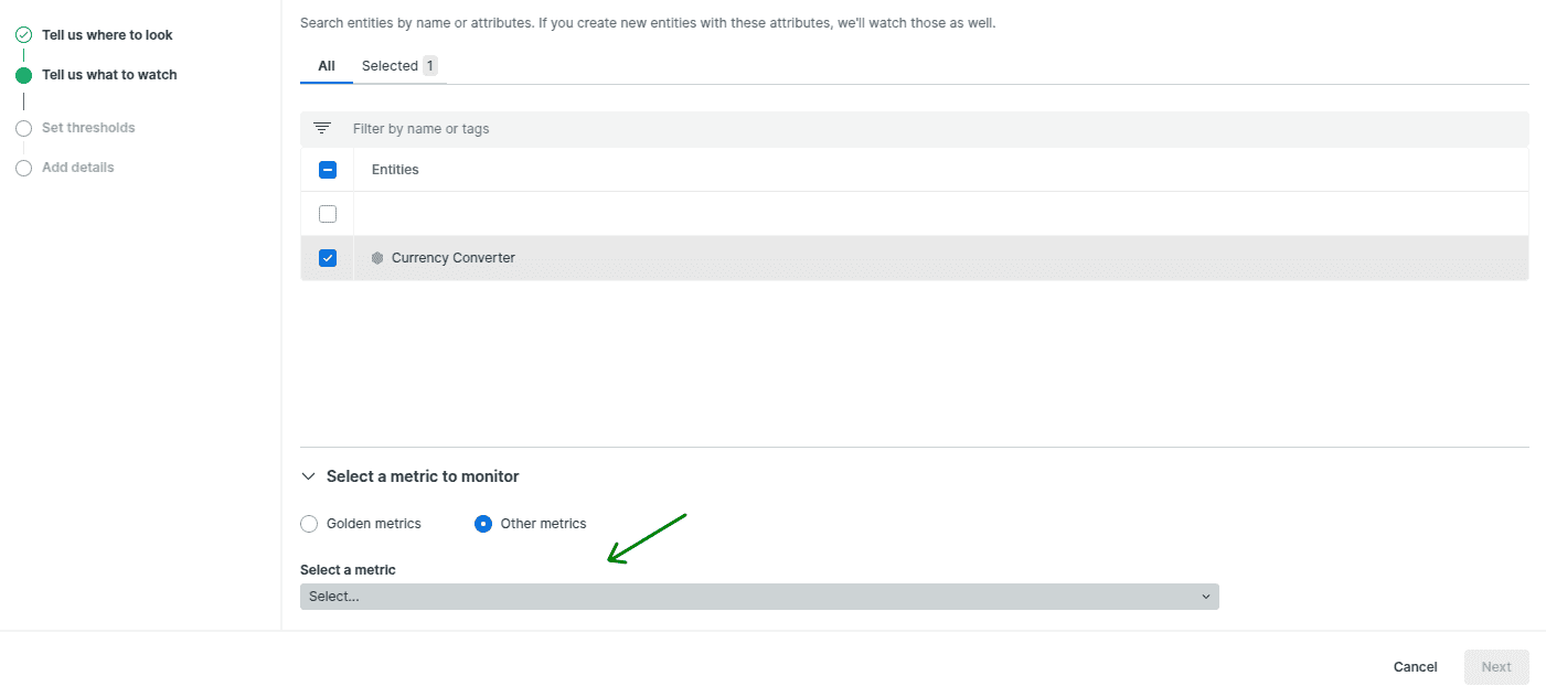 每次缓存未命中时,我们增加关联的metricTimesliceName计数器。接下来配置监控此指标的告警条件。