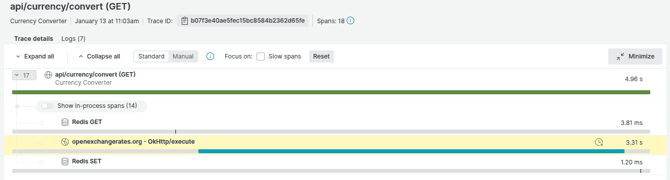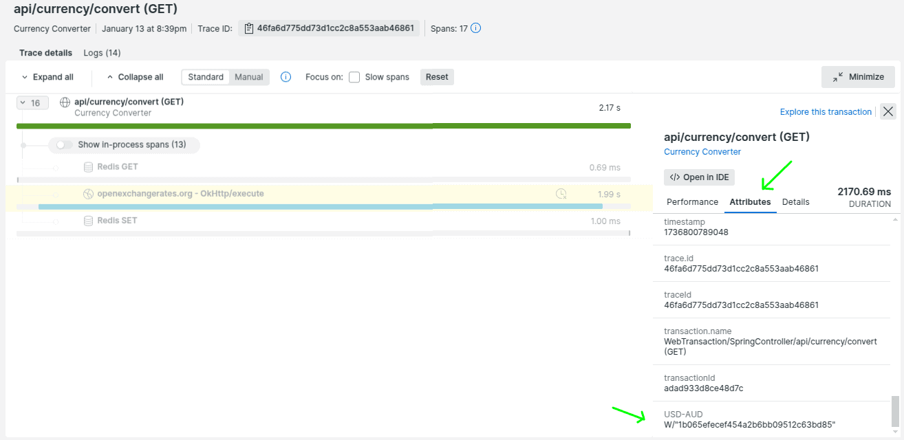 @Trace注解指示代理监控*getConvertedAmount()*方法,metricName属性为指标指定名称。我们手动捕获汇率 API 返回的 ETag 头信息作为自定义参数。