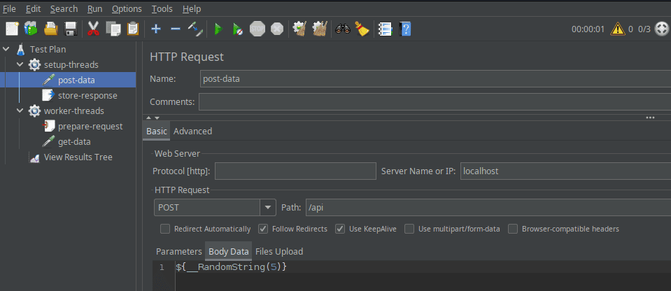 为提交随机测试数据,我们使用HTTP请求元素配合${__RandomString(5)}