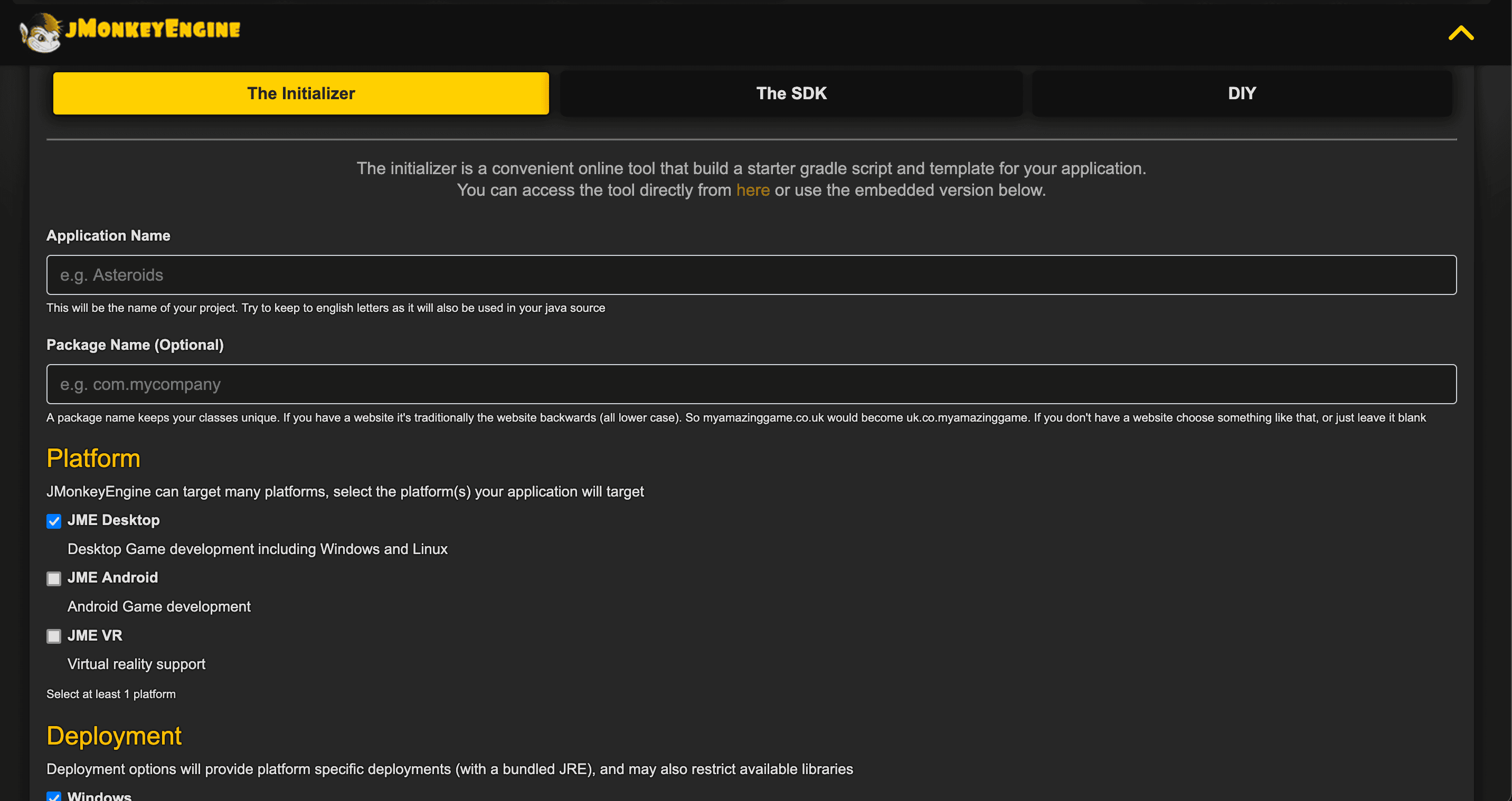 最简单的方式是访问官方初始化页面 https://jmonkeyengine.org/start/: