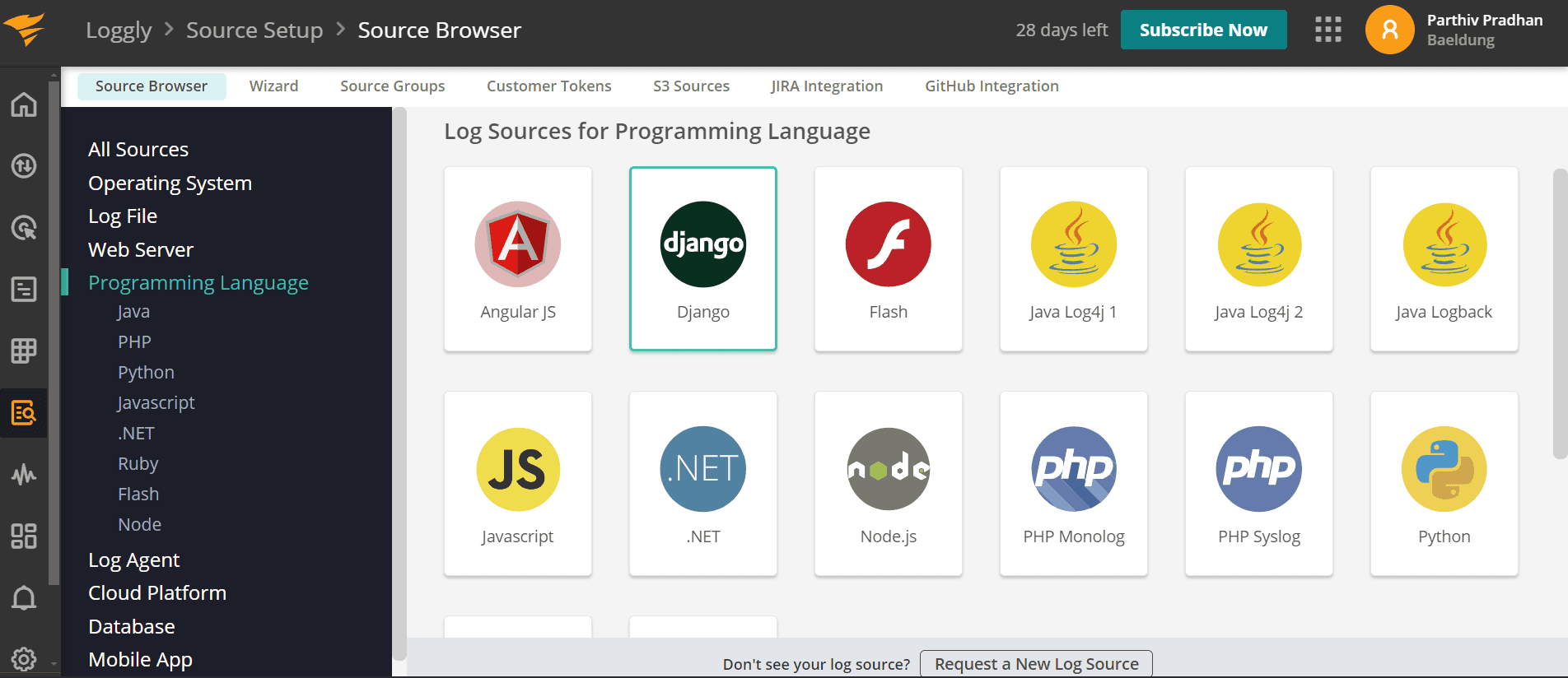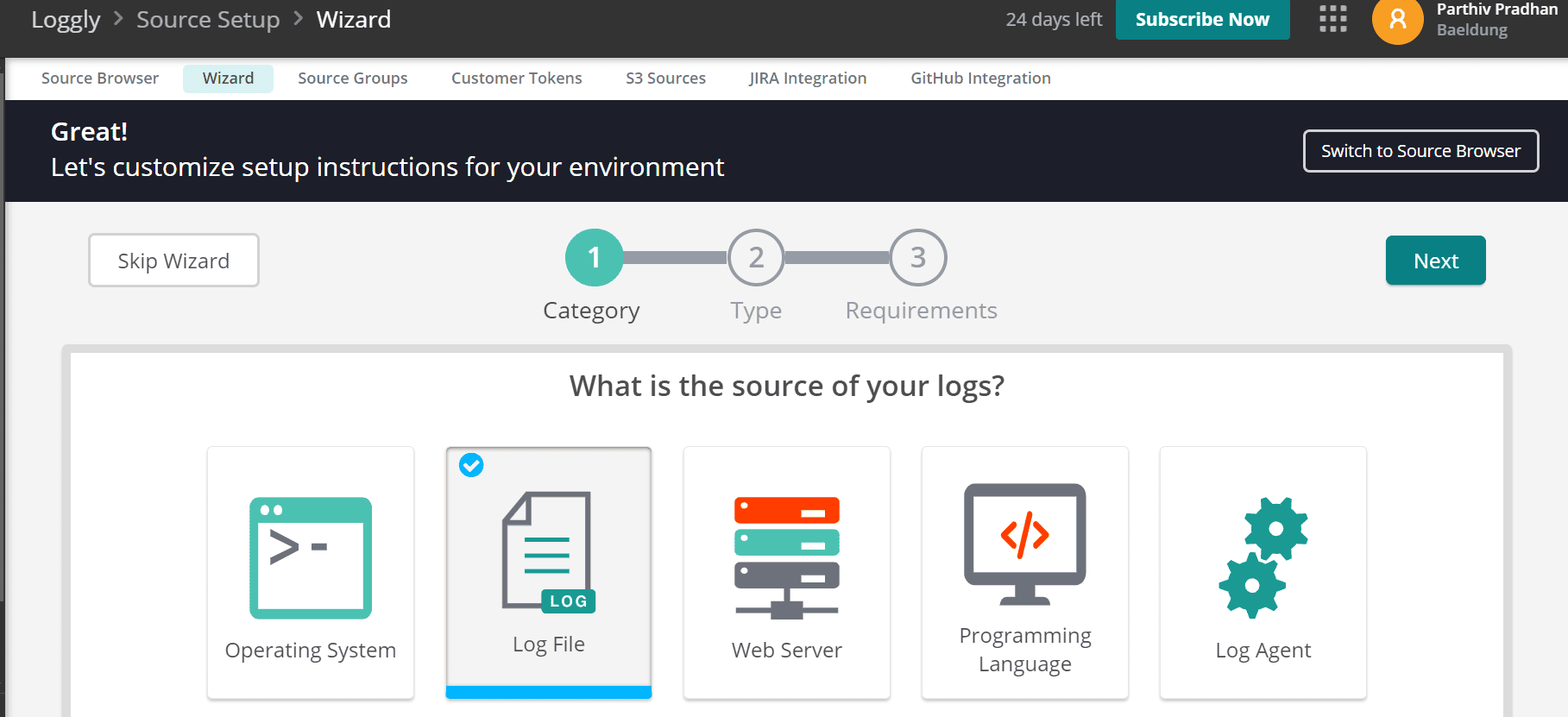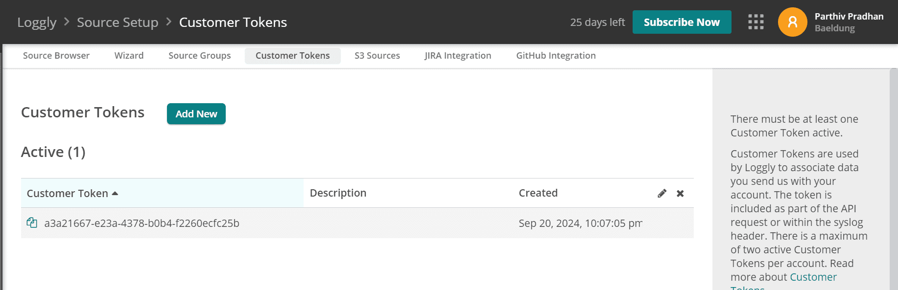 例如,在本教程中,我们创建了一个免费的 https://www.baeldung.loggly.com 账户: