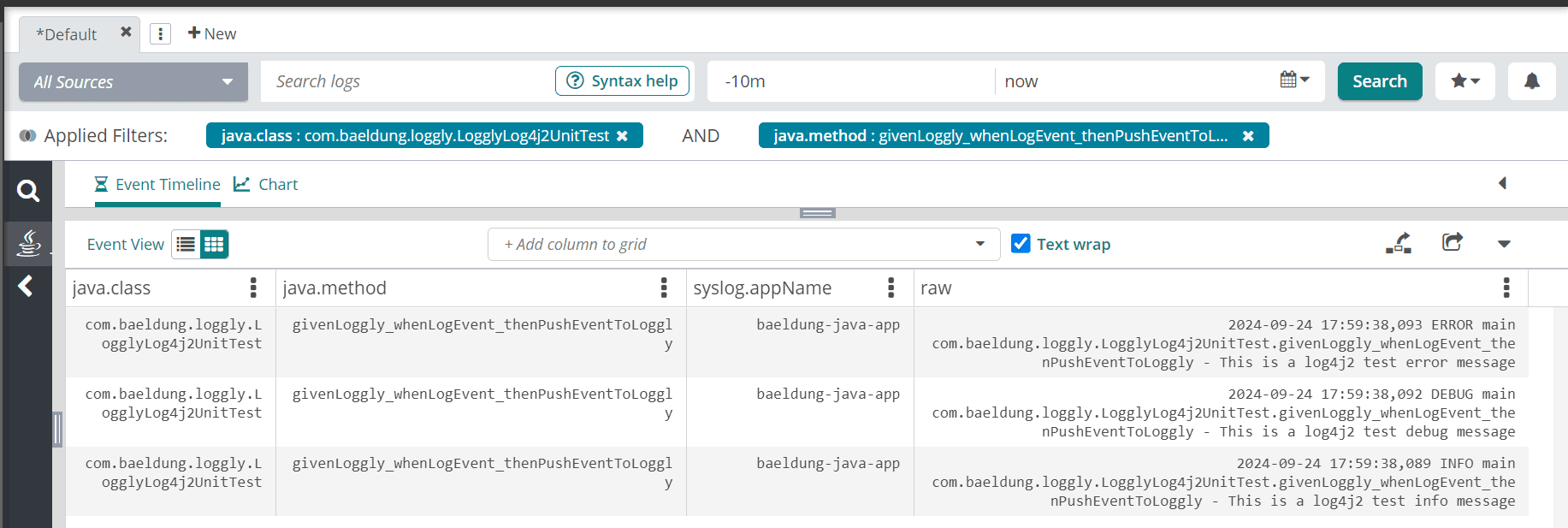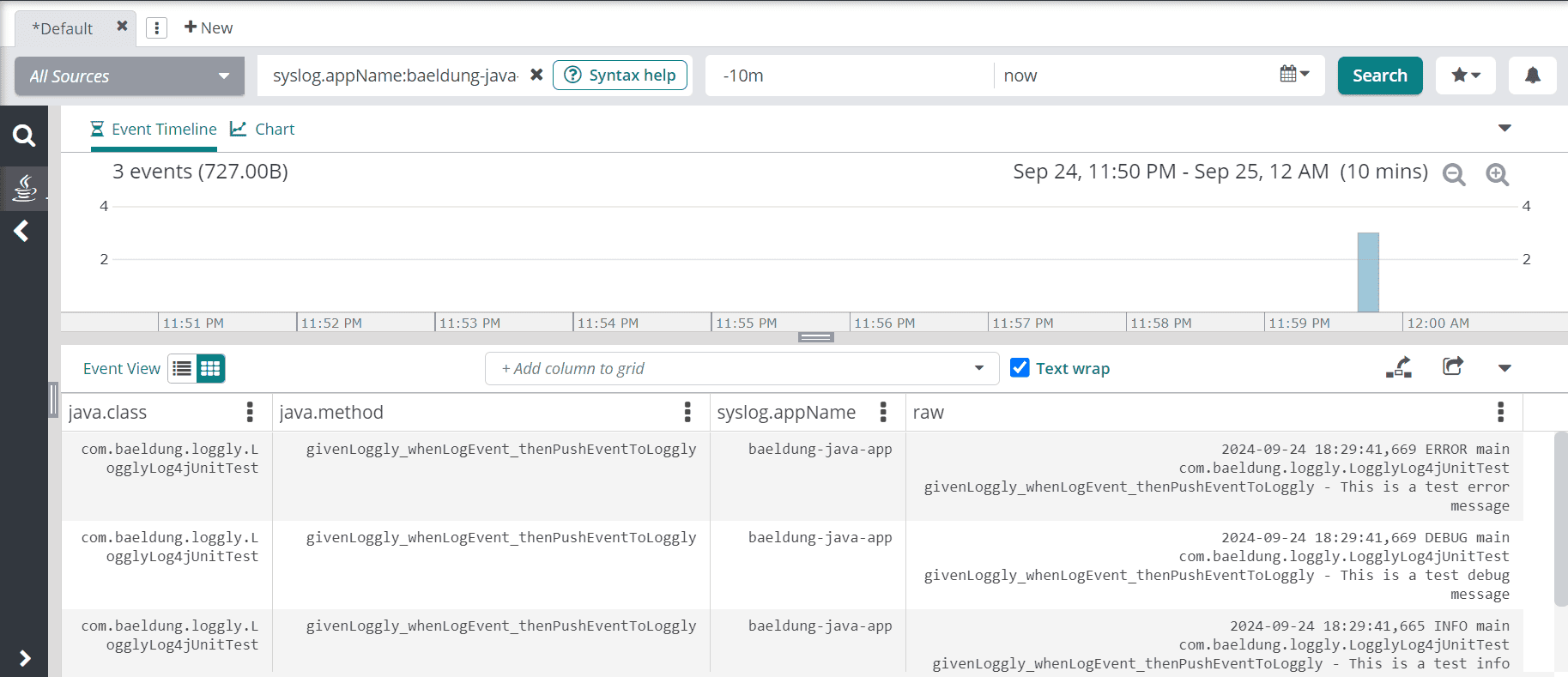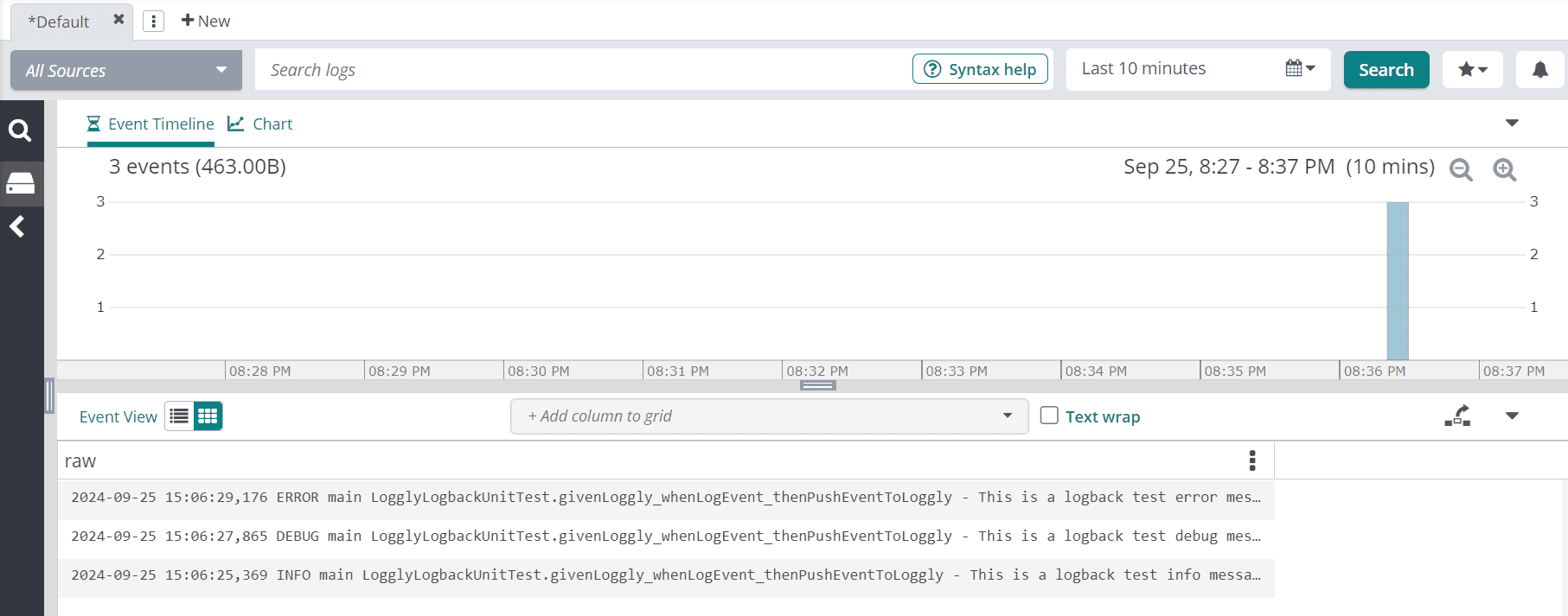 该程序使用了 SLF4J 框架的 Logback 实现。现在,让我们运行测试程序并检查 Loggly 日志浏览器: