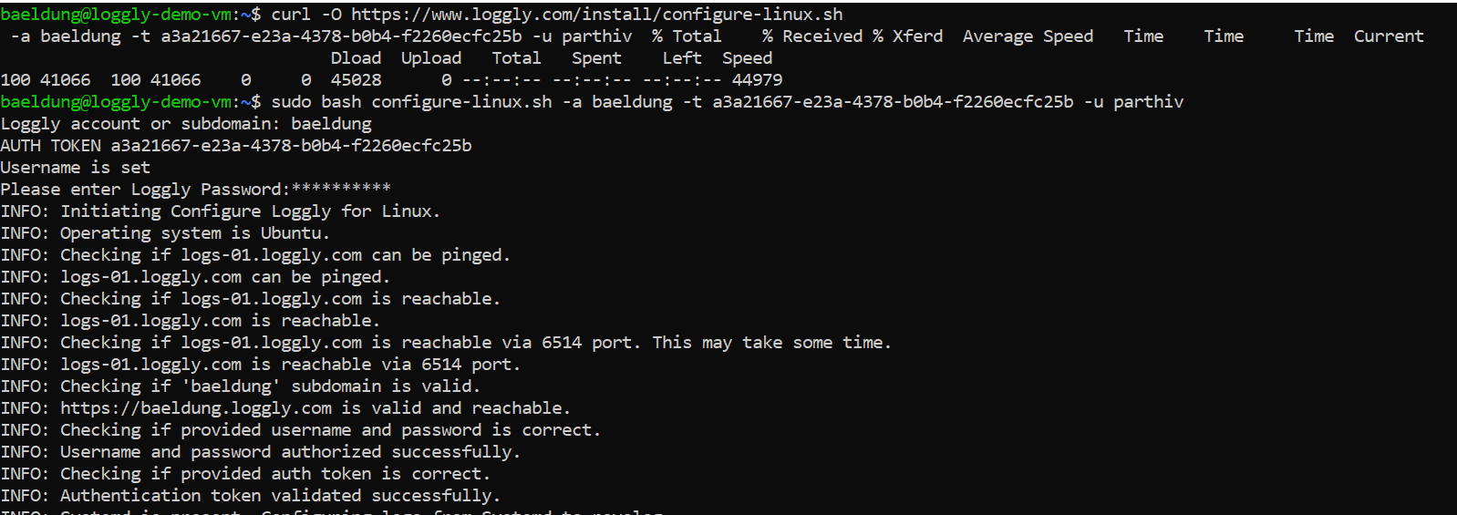 首先,我们运行 curl 命令下载 configure-linux.sh 脚本文件,然后通过从 Loggly 控制台复制命令来运行它: