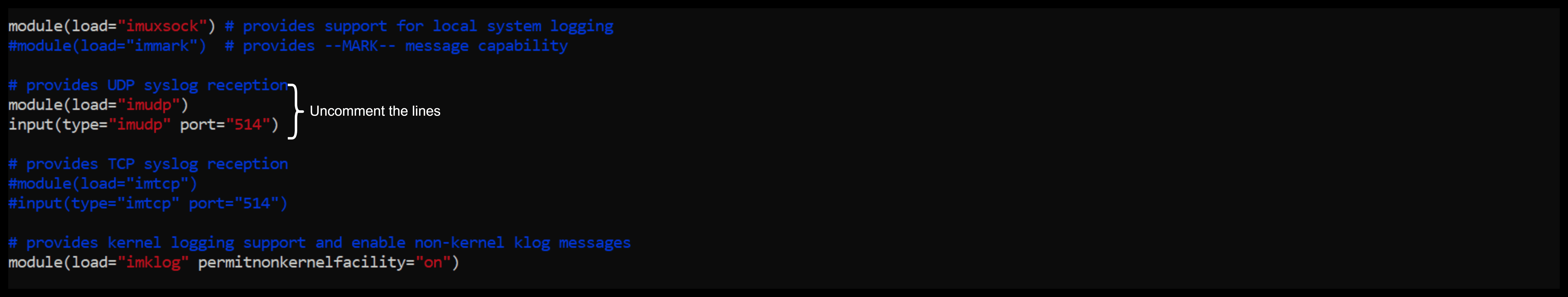 之后,我们在 /etc/rsyslog.conf 文件中取消注释一些配置,以启用在端口 514 上通过 UDP 传输日志: